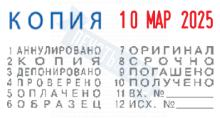 Высота шрифта: 3,8 мм. 12-ть бухгалтерских терминов. Дата справа красным цветом. Штемпельная подушка: красно-синяя.