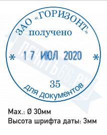 Ø 30 мм, высота даты: 3 мм. Со встроенной окрашенной штемпельной подушкой синего цвета.