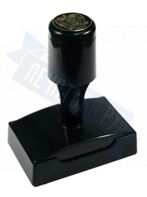 Ручная пластмассовая оснастка с крышкой для печати, штампа, факсимиле имеет клеевой слой для крепления клише печати.